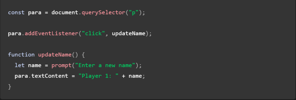 el bloque de código updateName() (líneas 5-8) se ejecuta. El bloque de código updateName() (estos tipos de bloques de código reutilizables se denominan «funciones«) pide al usuario un nuevo nombre y luego inserta ese nombre en el párrafo para actualizar la pantalla.
