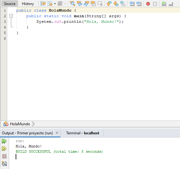 A continuación se muestra una imagen del programa «Hola Mundo» en Java ejecutándose en la consola usando la aplicación de Apache NetBeans: